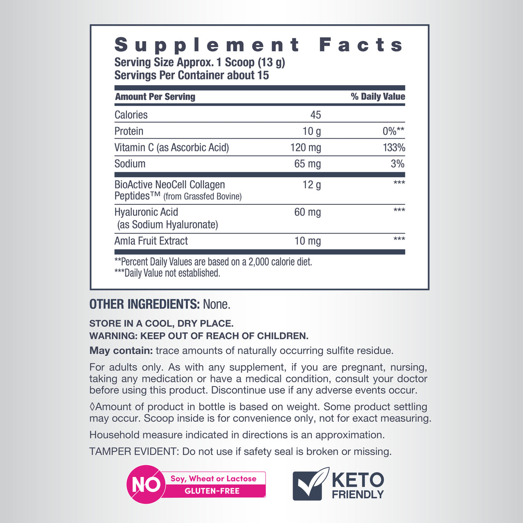 Glow begins beneath the surface. NeoCell® Advanced Collagen Peptides powder delivers 12 g of grassfed collagen peptides, plus Hyaluronic Acid and Vitamin C to support skin hydration, firmness, strong nails, and healthy joints.* Unflavored and effortless – just pure, daily beauty from within.