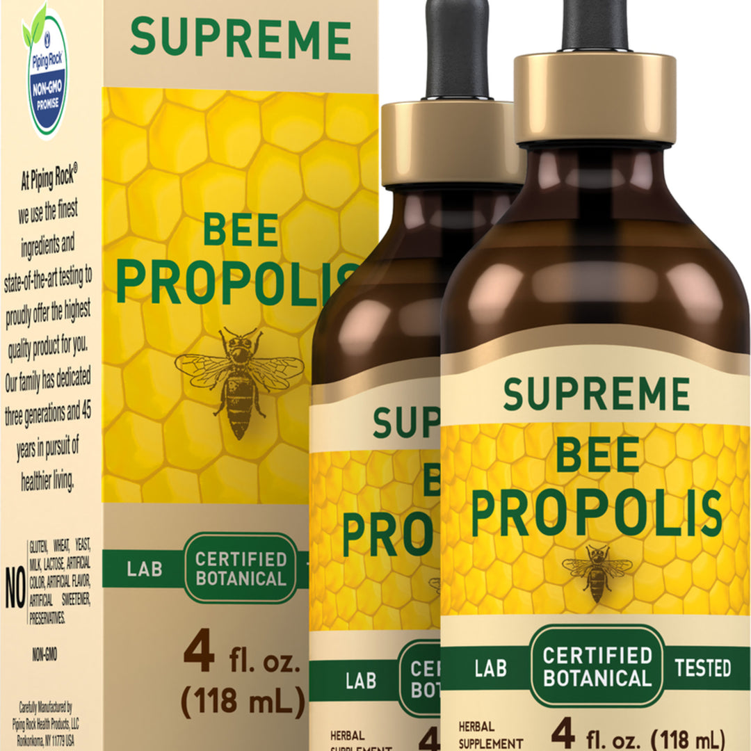 Propolis, often known as bee glue, is a resin-like material made by honeybees from the buds of poplar and cone-bearing trees. Treasured since ancient times, propolis has been widely used—from practical applications like supporting beehive structure to traditional wellness practices—and is revered for its numerous beneficial qualities. Each serving of Piping Rock’s Supreme Bee Propolis delivers 34 mg of 5:1 Bee Propolis extract, equivalent to 170 mg of Bee Propolis. This lab tested and certified botanical formula is non-GMO and contains no gluten, wheat, yeast, milk, lactose, artificial color, artificial flavor, artificial sweetener, and preservatives.