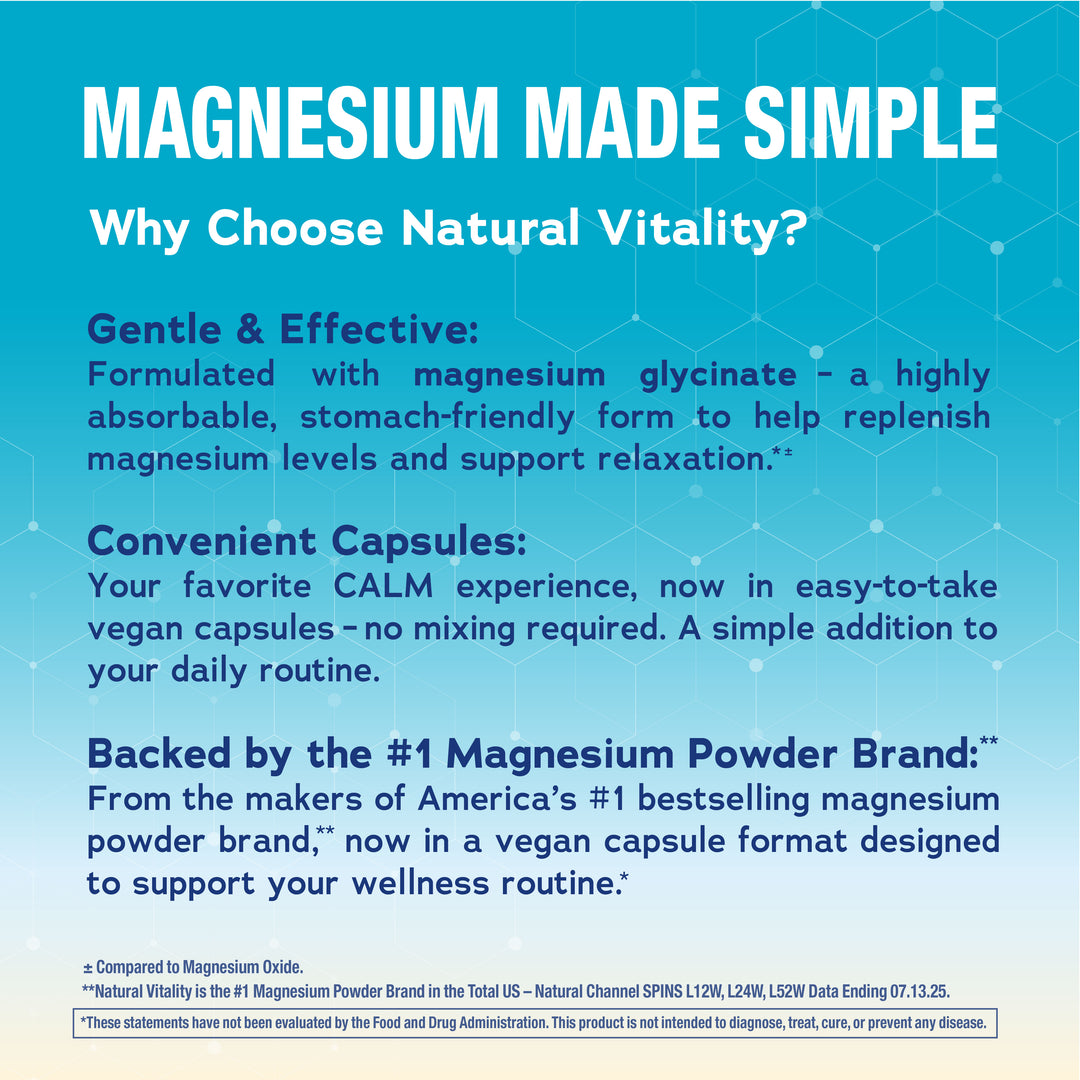 When your day feels off, balance starts within. Find your CALM and help replenish your magnesium levels with Natural Vitality CALM® Magnesium Glycinate Capsules.* These vegan capsules deliver highly absorbable ionic magnesium glycinate, helping you support healthy magnesium levels, conveniently.†* Whether at home or on the go, keep CALM and feel the difference.*