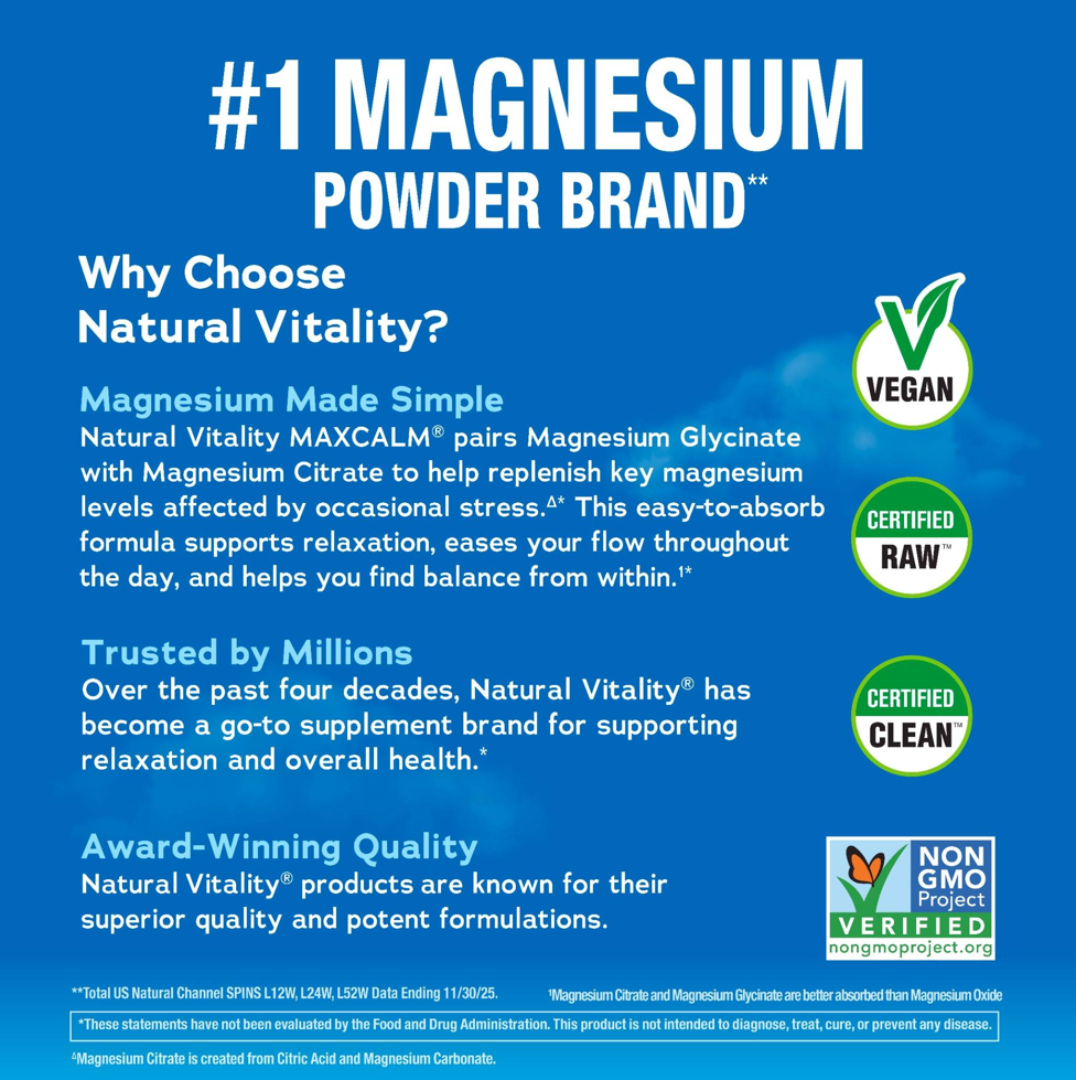 Sometimes, less is more. Natural Vitality CALM® Original Unflavored powder is a consumer favorite and a magnesium supplement like no other. Each serving delivers highly absorbable ionic Magnesium Citrate.△ 1 No sugar, no gluten, no artificial color—just CALM, your way. Simply mix with warm water, and watch as it fizzes and bubbles to life! Then, sip and enjoy a soothing cup of CALM.*