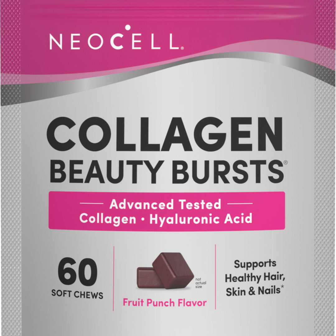 Beauty definitely shouldn’t be bland. NeoCell® Collagen Beauty Bursts® deliver 2,000 mg of BioActive NeoCell Collagen Peptides™ and 17 mg of Hyaluronic Acid per serving in delicious fruit punch flavored soft chews. No mixing, no mess, no pills – just two tasty soft chews daily to give your beauty a boost, and support healthy hair, skin, and nails.*
