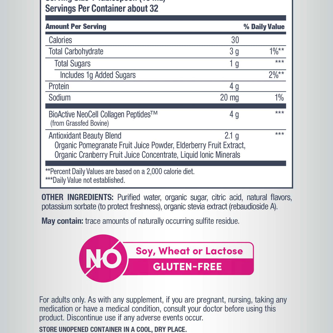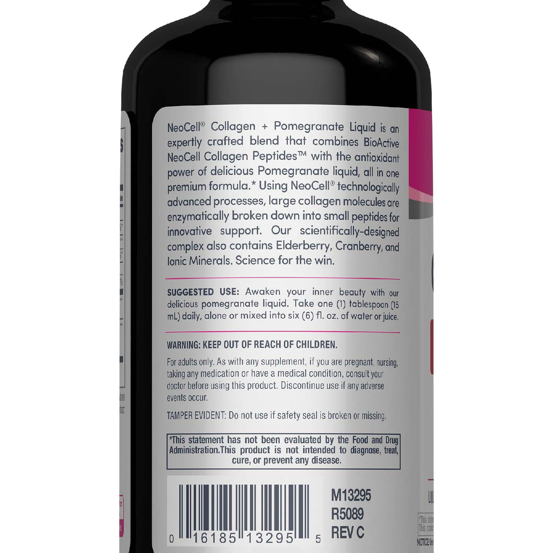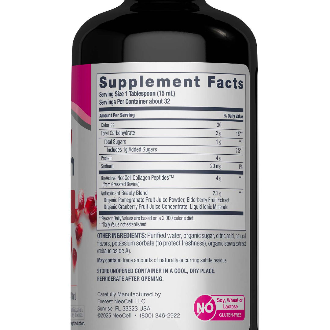 Unveil your inner beauty with our delicious pomegranate-flavored Liquid Collagen, expertly crafted with a unique Antioxidant Beauty Blend. Each serving delivers 4 grams of BioActive NeoCell® Collagen Peptides™, made up of Collagen Types 1 and 3; plus, an Antioxidant Beauty Blend.