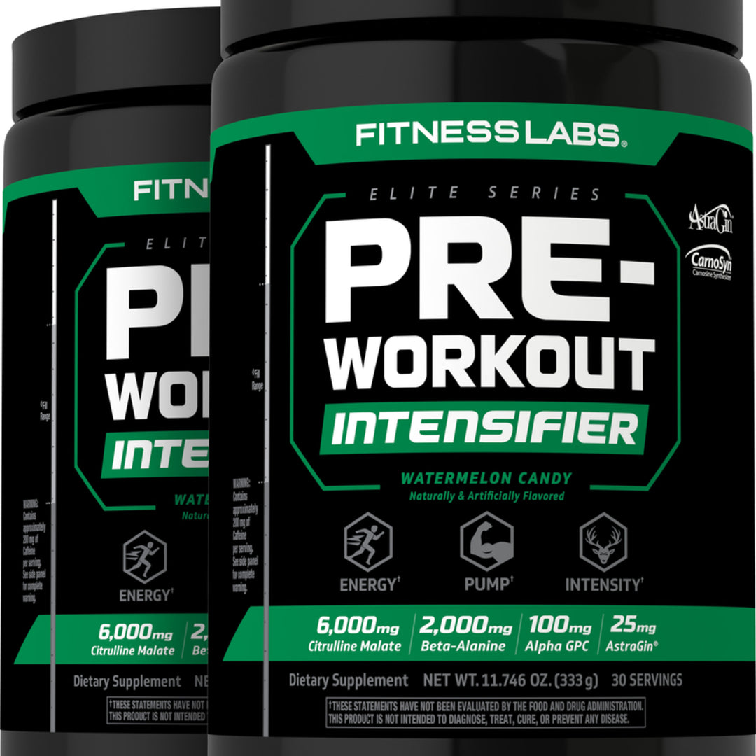 Science-based nutrition collides with hard-hitting pre-workout formulation to create Pre-Workout Intensifier by Fitness Labs. This superior pre-workout powder is a true force, featuring patented ingredient (CarnoSyn®) Beta-Alanine, along with 200 mg of highly concentrated Caffeine per serving, and other beneficial vitamins, aminos, and electrolytes. Try this best-selling Pre-Workout Intensifier and get a blast of mouth-watering watermelon candy flavor with each scoop!
